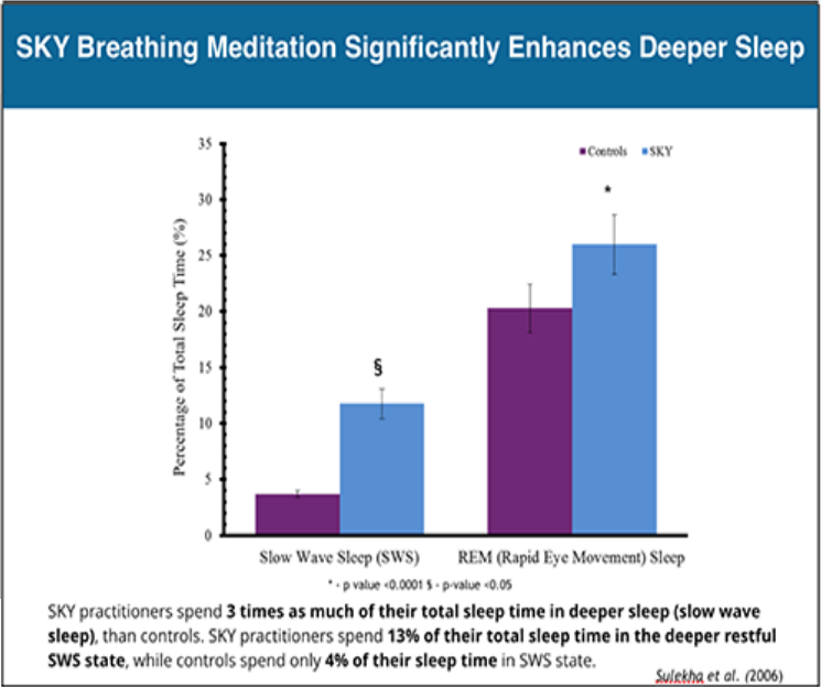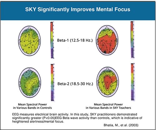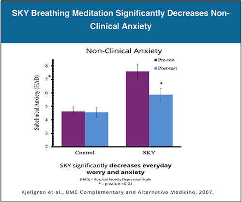 There are over 100 published studies on SKY, most in peer-reviewed journals, showing a wide range of physical, mental, and emotional benefits. Many benefits are seen immediately from SKY. A study on veterans with PTSD found the significant benefits they gained from one week of SKY practice were still present one year later even among those who didn't continue practicing at home.